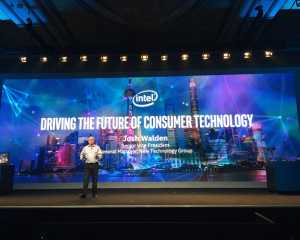 在下午的主题演讲中,一个小时的时间也被英特尔安排得花样百出。一位身着白衣的女性以一段3分钟的武术开头,她拳脚伸展的路径被投放在身后的大屏幕上。