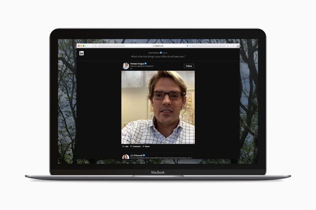 LinkedIn的“网红”将会使用特制的Record应用制作视频,这款工具目前也只对这些“网红”开放。这些视频将会出现在用户的信息流中,一旦点击视频,便会启用黑色背景的全屏模式。